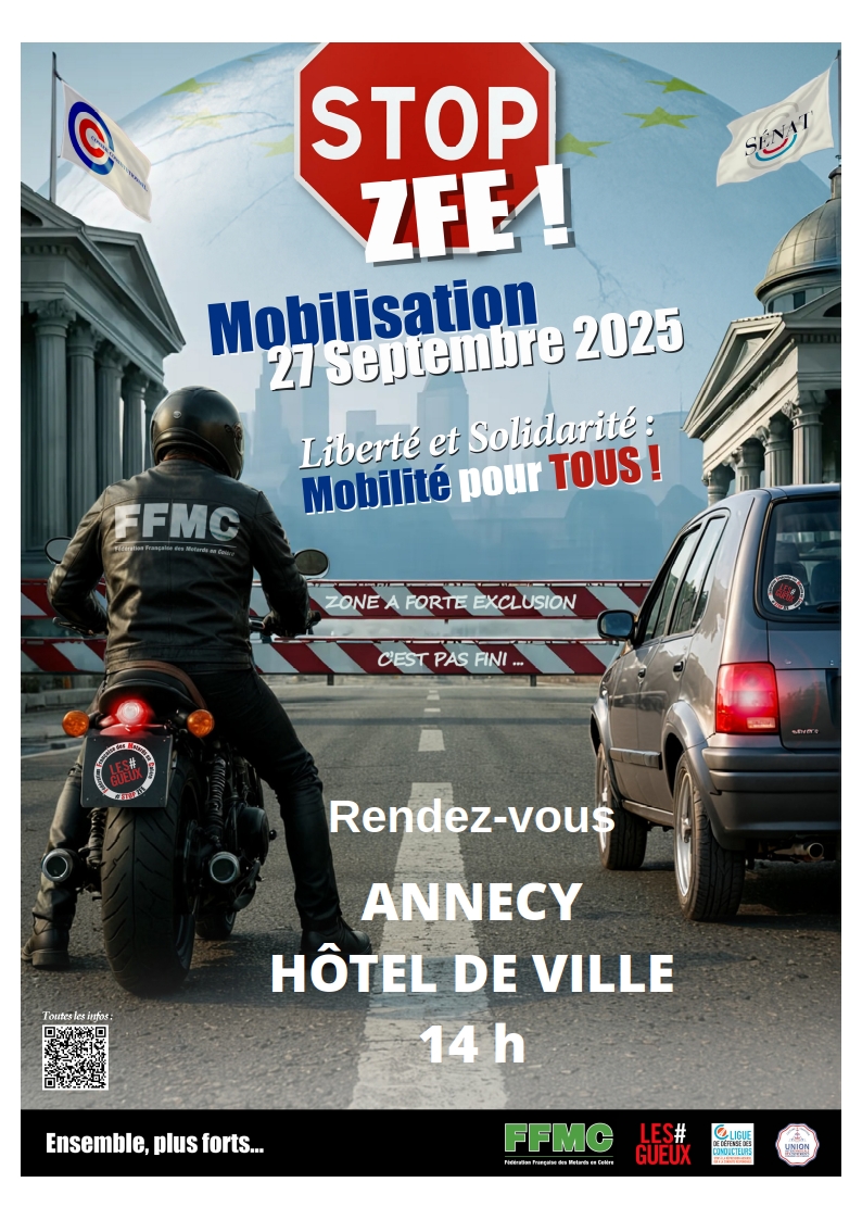 Dans le cadre du mouvement national contre les ZFE de la FFMC, l’antenne 74 appelle à se retrouver samedi 27 septembre 2025 à 14h devant l’hôtel de ville d’Annecy, pour dire NON AUX ZFE.